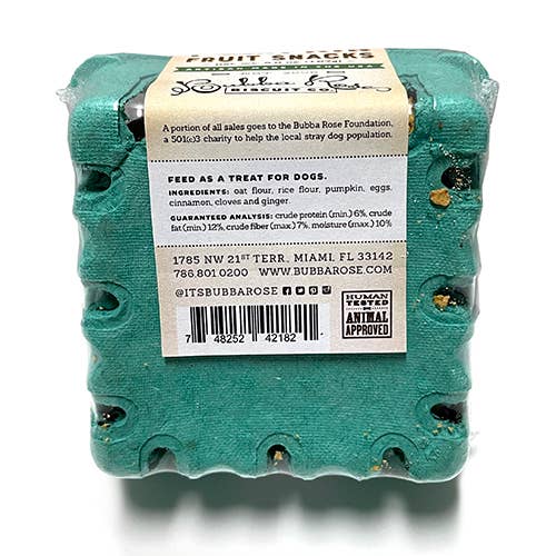 All Natural & Preservative Free - Healthy & simple ingredients - Wheat, corn, soy & gluten free - A portion of all sales goes to the Bubba Rose Foundation, a 501(c)3 charity to help the local stray dog population Ingredients: oat flour, rice flour, pumpkin, eggs, cinnamon, cloves and ginger. Guaranteed analysis: crude protein (min.) 6%, crude fat (min.) 12%, crude fiber (max.) 7%, moisture (max.) 10%