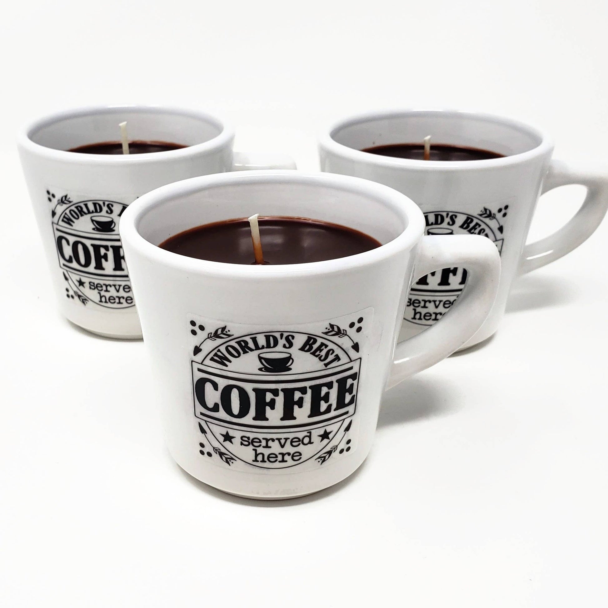 World's Best Coffee served here in this real coffee mug filled with fresh brewed coffee scented soy wax.