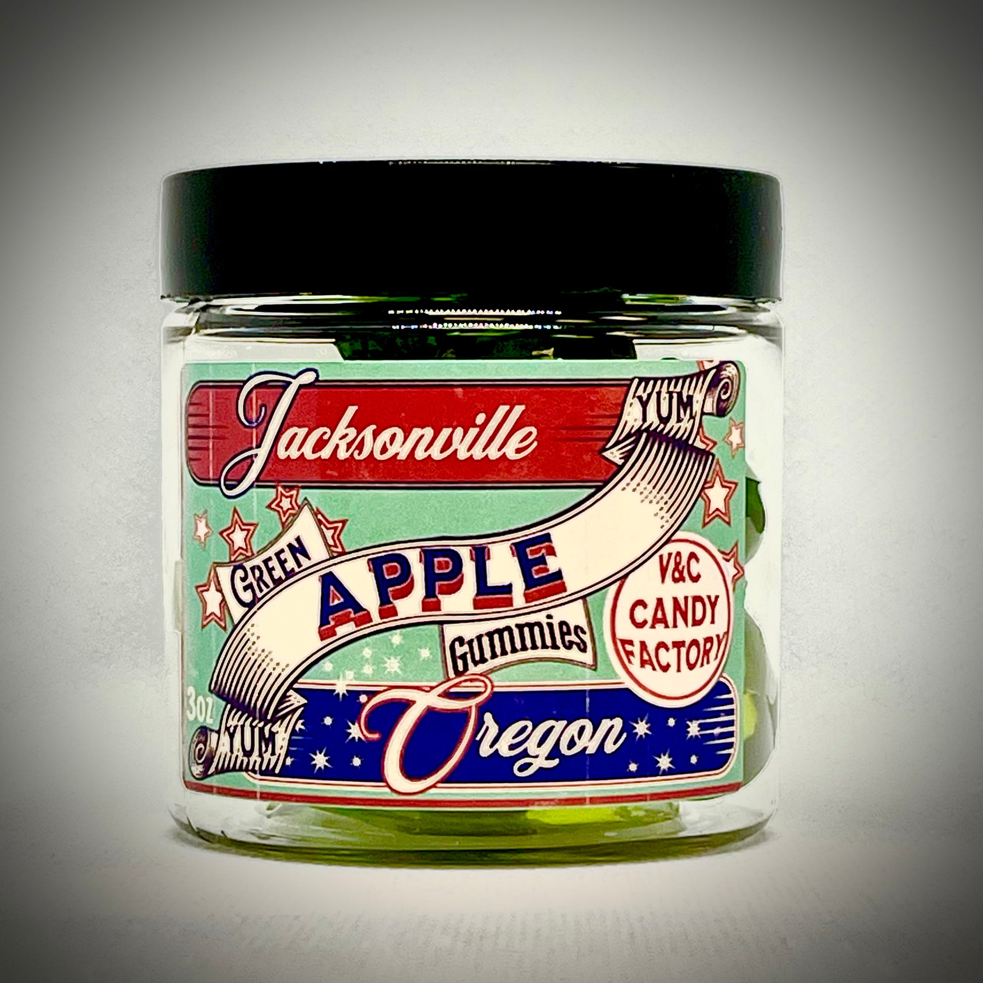 Mmmm! These yummy gummies are like petite little apples, but they're green and from V&C Candy Factory in Jacksonville, Oregon. Sweet, chewy, and absolutely scrumptious!