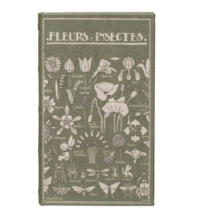 Fleurs et Insectes - Beautifully crafted secret storage book. Decorated like a vintage classic novel with a canvas cover - front and back. Wood boxes decorated to look like realistic book pages, no one would ever know. Opens to a felt covered interior secret storage spot.